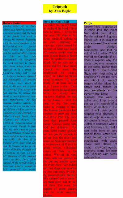 That Sunday three of us drove almost as a family to turn over a word processor the head of the family had used in writing his memoir, beginning with the loss of members of his Italian-Hungarian Jewish family during the khurbn and his survival after crossing the Alps on foot into Switzerland. We transported the word processor to Mason City, Iowa, where a man we expected would be a priest—found via Craig's List—met us halfway between Grinnell and Minneapolis. Al corrected our vision over lunch at Perkins. He was not a priest but a retired U.C.C. pastor who had searched to replace his word processor model, now past manufacture. He had resumed writing sermons by hand, and it was not going as well. He did not want to convert to Internet in buying a new computer. We talked through lunch about religions and history. The wretch in “Amazing Grace” is not a wretch though he feels like one, who comes to accept God's acceptance, Al said. Then lunch ended in keeping to our time table. The three of us traveled seven hours that day and Al traveled as far in the service of finding the right tool for his writing. In part, we were left thinking of Al's pastoral service to Britt, Iowa, Hobo Capital of the World, where a hobo had killed a woman he had promised to marry.